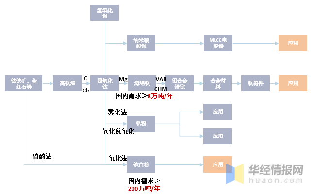 鈦合金產業(yè)鏈一般涵蓋海綿鈦的制備,鈦材制備和鈦材應用三部分,其中前兩部技術復雜、制備難度大,是鈦應用的難點和關鍵環(huán)節(jié),海綿鈦和鈦材質量直接決定鈦制品質量。鈦工業(yè)是冶煉技術復雜、加工難度高,技術含量高的技術、資金密集型產業(yè),目前主要瓶頸在于生產成本高,鈦材價格昂貴,制約了其產量提高和推廣應用。未來隨著鈦冶煉和加工技術的改進,成本必將隨之降低,鈦材的特性必使其相對其他金屬有顯著的替代效應,未來鈦工業(yè)發(fā)展相當廣闊。