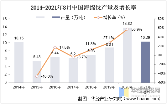 海綿鈦是鈦合金的上游主要原料,經(jīng)歷2014-2015年期間的變革后,我國海綿鈦產量急劇下降,2015年產量為54785噸,同比減少46.02%,隨著高端鈦合金應用領域的拓寬,2015-2019年我國海綿鈦產量持續(xù)增長,從5.48萬噸增長至8.81萬噸,年復合增長率達到12.61%,2020年產業(yè)持續(xù)復蘇,海綿鈦產量達到13.82萬噸噸,同比2019年增長56.9%。2021年1-8月產量為10.29萬噸。
