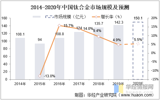 2014至2015年,受到我國國民經(jīng)濟結構調整的影響,上游海綿鈦產量快速下降和下游傳統(tǒng)化工、冶金等傳統(tǒng)工業(yè)領域對鈦合金的需求出現(xiàn)下滑,導致鈦合金產值下降,而伴隨我國產業(yè)結構調整初見成效,航空航天、海洋工程等高端鈦合金應用領域獲得快速發(fā)展,2015年后鈦合金產值穩(wěn)步提升。2014至2019年,我國鈦合金行業(yè)市場規(guī)模從108.1億元人民幣增長至142.3億元人民幣,年復合增長率為7.11%。在我國產業(yè)結構不斷調整與升級的背景下,高端鈦合金市場空間龐大,具有高附加值的高端鈦合金需求將穩(wěn)步增加,預計2020年我國鈦合金行業(yè)市場規(guī)模將突破150億元。