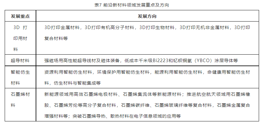 前沿新材料領(lǐng)域發(fā)展重點(diǎn)及發(fā)展方向主要包括3D打印用材料、超導(dǎo)材料、智能仿生材料、石墨烯材料等(見(jiàn)表7)。