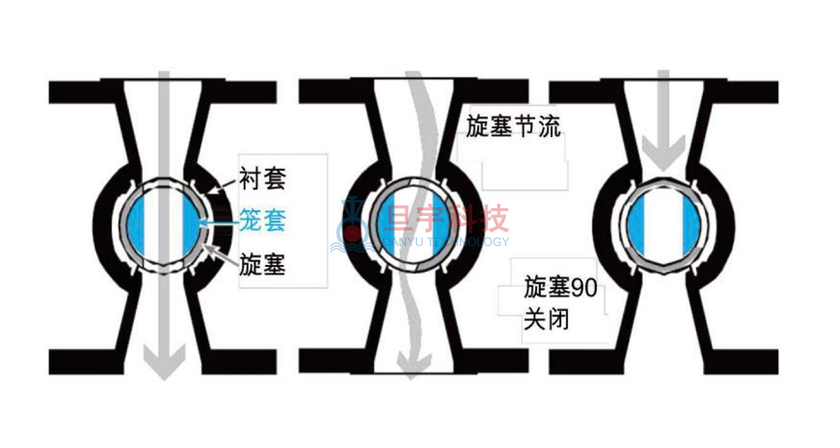 內(nèi)籠式旋塞閥,節(jié)流時是金屬對金屬密封,切斷時是金屬對襯套的密封。在節(jié)流時,內(nèi)籠套擋住了襯套,保護(hù)襯套免受流體的侵蝕。
